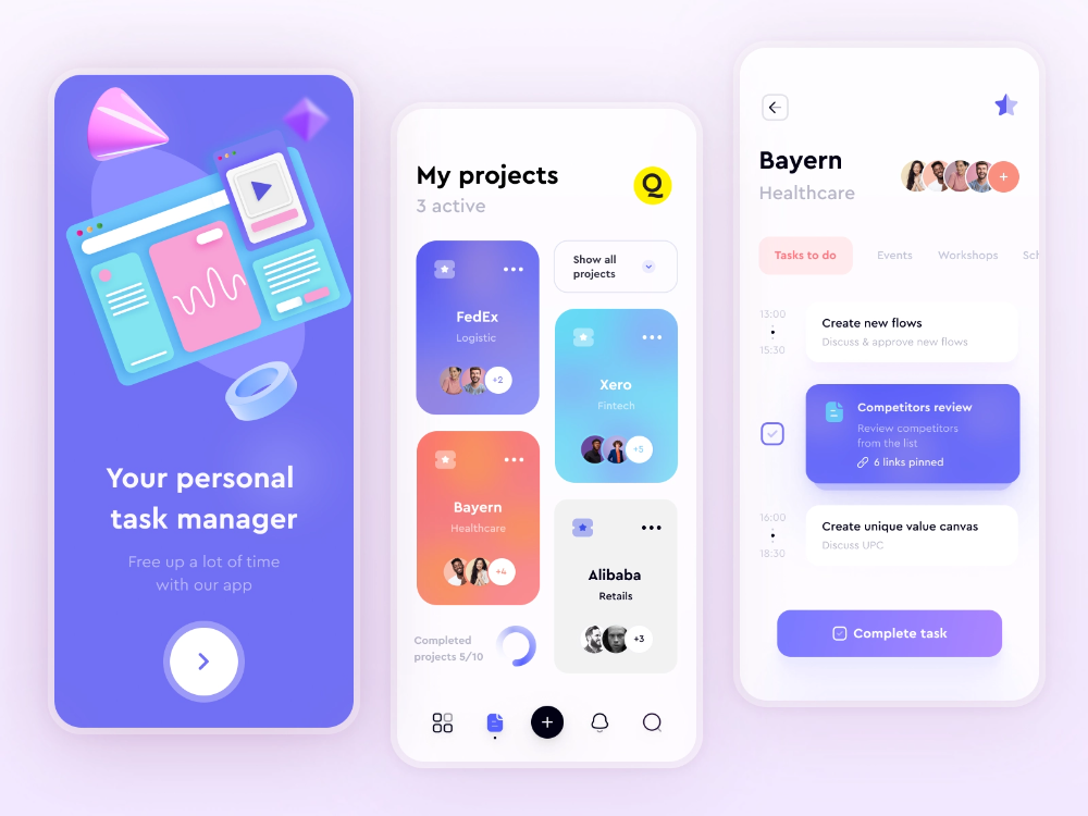• 案例對應:醫療預約界面整合 “日程日歷”“訪客統計”“預約詳情” 三大模塊,任務管理應用用色彩卡片區分不同項目,提升信息獲取效率。