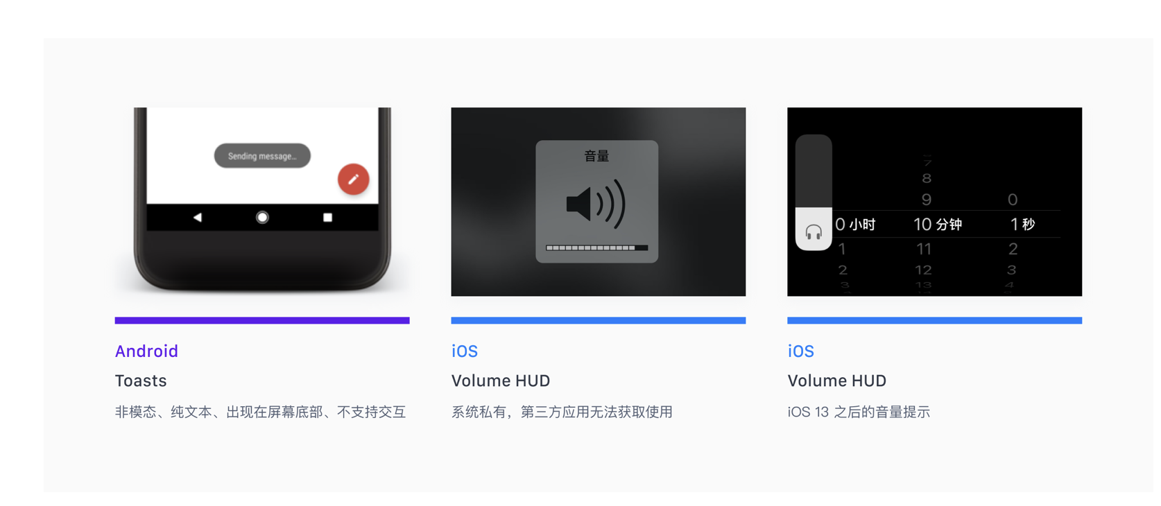 - 使用場景:通知操作結(jié)果(如 “保存成功”“加載失敗”)、短暫狀態(tài)提示(如 “音量調(diào)節(jié)”)。