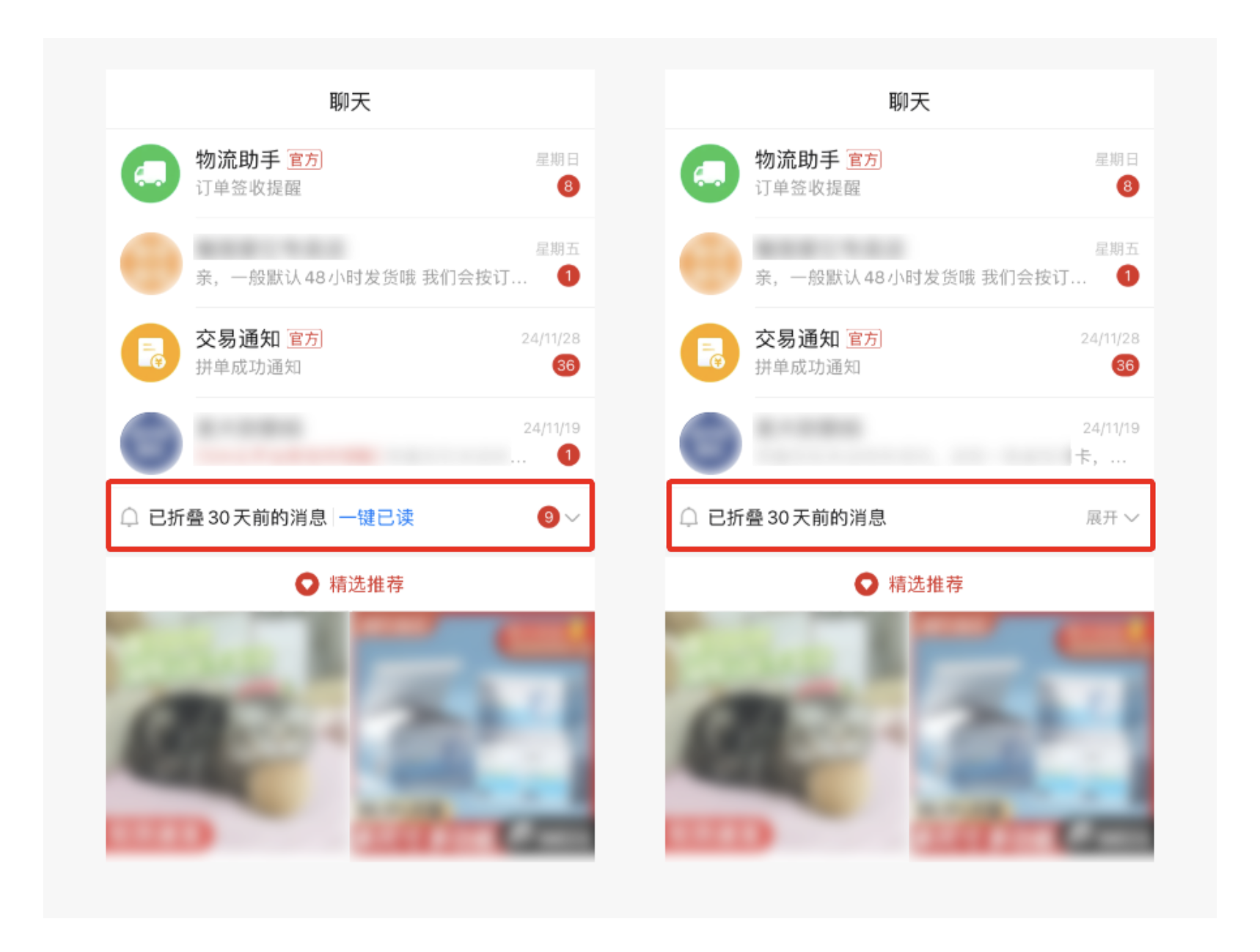 設(shè)計目的:通過分層已讀設(shè)計,平衡小紅書的社交與消費雙重屬性,既堅守了內(nèi)容社交的核心,保障社交互動的有效性,又滿足了用戶清理消費類消息的需求,提升消費場景的體驗。