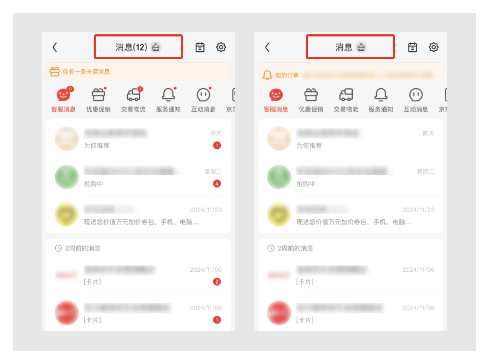 - 消費相關(guān)消息(客服對話、系統(tǒng)通知)單獨設(shè)置 **「全部已讀」** 按鈕,置于各分類的頂部,支持精準清理;
