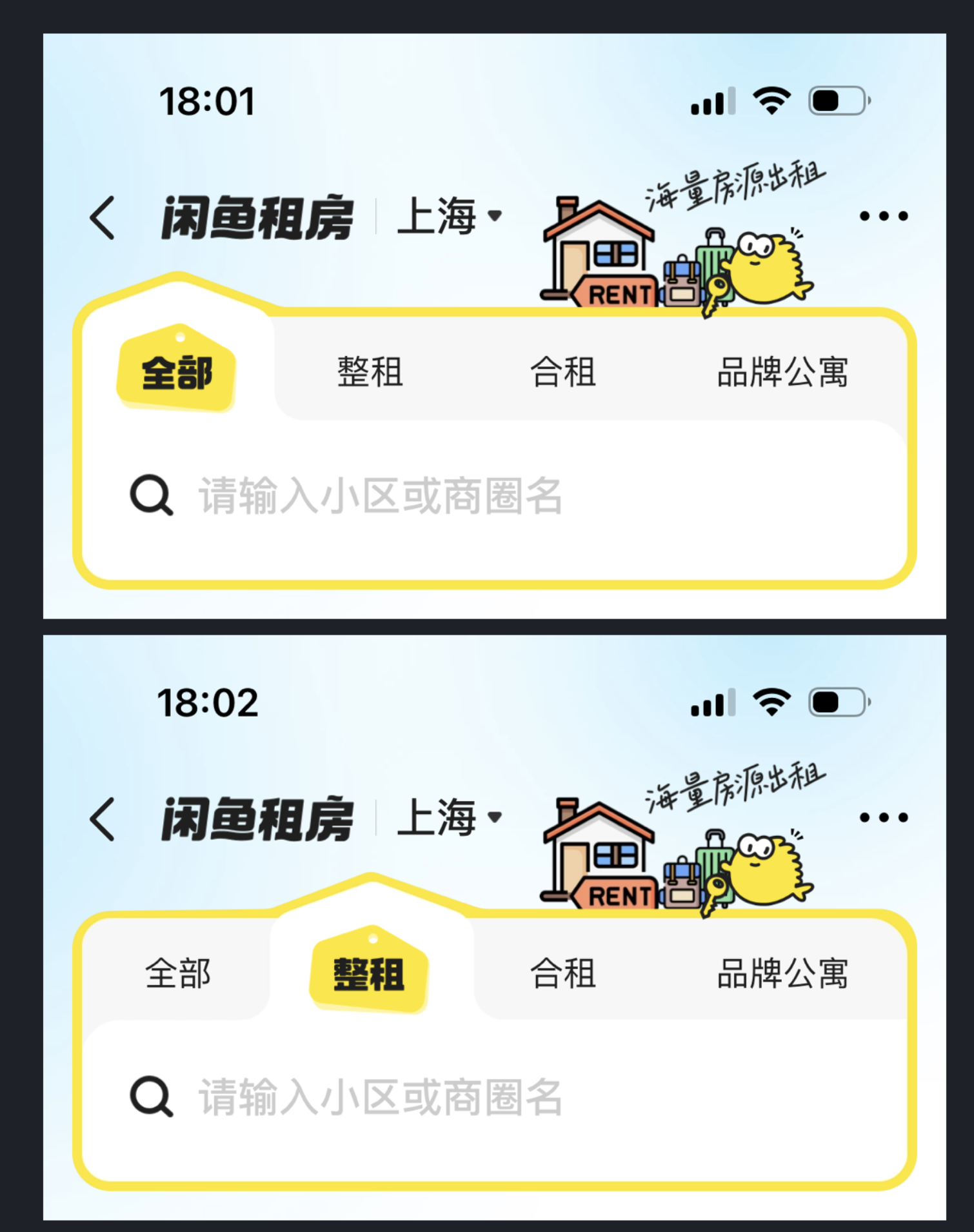 閑魚租房欄目的卡片設(shè)計便是典型,它摒棄了常規(guī)的矩形卡片框架,將房屋結(jié)構(gòu)的輪廓融入卡片造型,用極簡的幾何圖形還原戶型特征,既貼合租房的業(yè)務(wù)核心,又讓卡片設(shè)計跳出了同質(zhì)化的視覺桎梏。這種將業(yè)務(wù)特征與視覺設(shè)計結(jié)合的方式,不僅讓卡片更有辨識度,還能讓用戶一眼感知到功能屬性,實現(xiàn)了美觀與實用的雙重效果。