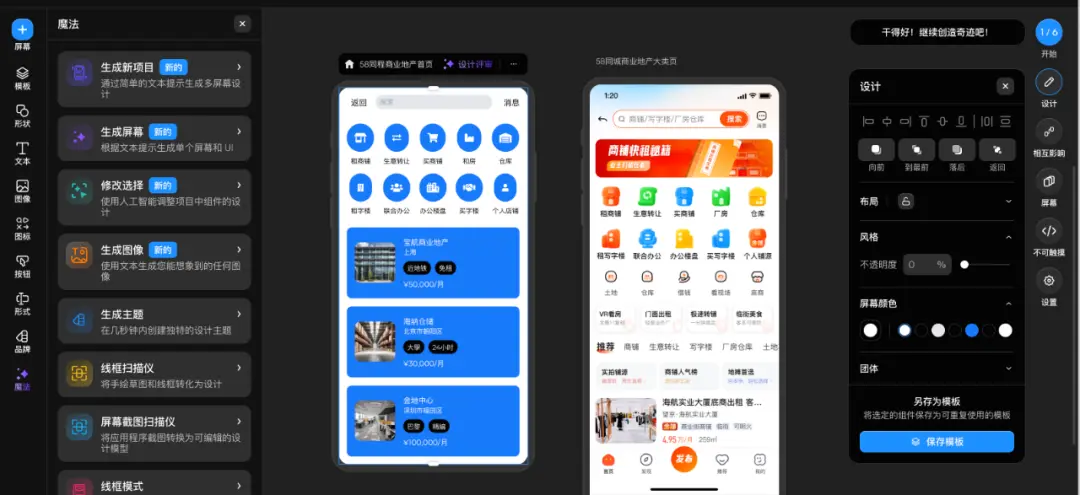 例如,設(shè)計(jì)師為 58 同城商業(yè)地產(chǎn)板塊設(shè)計(jì)移動(dòng)端大類頁面時(shí),僅需向 Uizard 明確設(shè)計(jì)需求:頭部導(dǎo)航包含返回、搜索、消息功能,入口金剛區(qū)以圖標(biāo)形式展示租賃商鋪、商業(yè)轉(zhuǎn)讓等 10 個(gè)功能,下方搭配包含圖片、標(biāo)題、標(biāo)簽、價(jià)格的推薦列表,并選擇高精度生成模式,AI 即可在幾分鐘內(nèi)完成初步的界面原型生成,大幅縮短了從草圖到數(shù)字原型的轉(zhuǎn)化時(shí)間,讓設(shè)計(jì)師能快速驗(yàn)證設(shè)計(jì)概念。