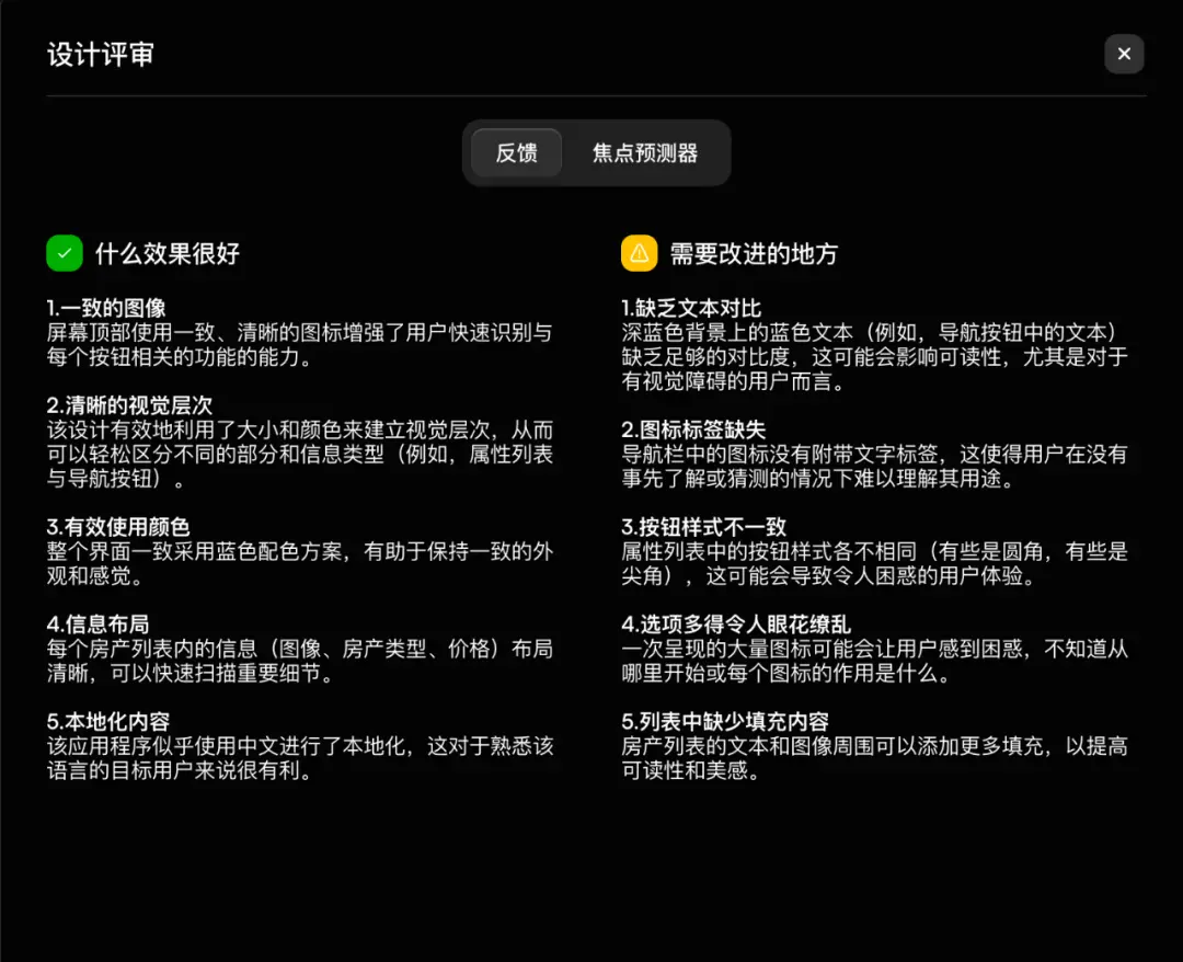 不難發(fā)現(xiàn),Uizard 能高效檢測布局、配色、組件等顯性設(shè)計(jì)問題,但無法對(duì)設(shè)計(jì)背后的業(yè)務(wù)策略與用戶心智匹配度進(jìn)行評(píng)估。
