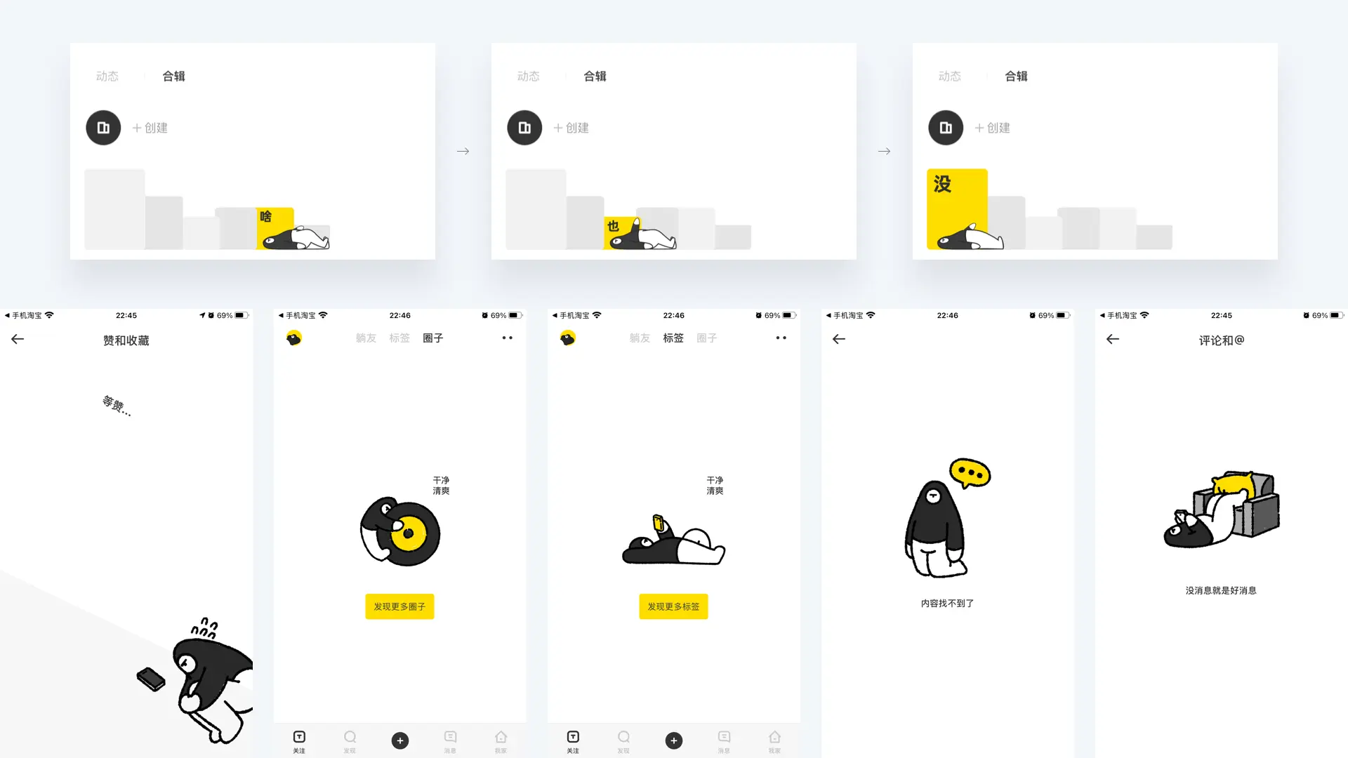 設計師可結合產(chǎn)品屬性與品牌視覺體系,延展圖形設計,搭配動效、插畫等形式,豐富缺省頁內容。比如躺平的空白頁,設計出賤萌有趣的視覺場景,一句 “沒消息就是好消息”“內容找不到了,發(fā)現(xiàn)更多圈子”,讓用戶在無奈的場景下會心一笑,將負面情緒轉化為輕松的體驗,讓產(chǎn)品充滿趣味性與人情味。