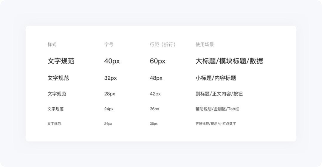 文字規(guī)范的核心是明確核心屬性,按場景分類,避免樣式混亂,核心包含 4 個基礎屬性:字體、字號、字重、行高;針對不同使用場景制定對應的文字樣式,并整理成標準化表格,方便查閱與調(diào)用。
