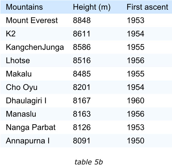 表格中的項目應該通過某種排序的手段來滿足閱讀者的興趣。我們來看下面的兩個表格,左面的展示了世界上最高的十座山峰,鑒于“高度”最受關注,那么表格的項目就是按照這個字段降序排列的。這樣最受關注的信息能夠排在表格的最前面。
