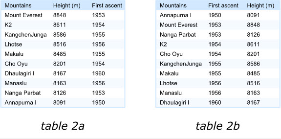 然而,如果讀者實際關注的是山峰首次登頂的時間,那么在左面的表格中,讀者就需要費一番力氣去找到第一個被登頂的山峰。顯然右側的表格排序方式將會更合理。