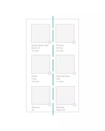 軸最常見于對稱元素的使用,當元素被布置成軸對稱的布局的時候,會給人有序感。就像生活中絕大多數(shù)的事情一樣,我們更傾向于享受有序的的東西,它們令人感覺平穩(wěn)、舒適、平易近人。最簡單的一個例子就是iTunes 程序中的專輯列表的設(shè)計,所有的專輯列表在界面的左側(cè)保持對齊,圍繞虛線軸軸對稱。