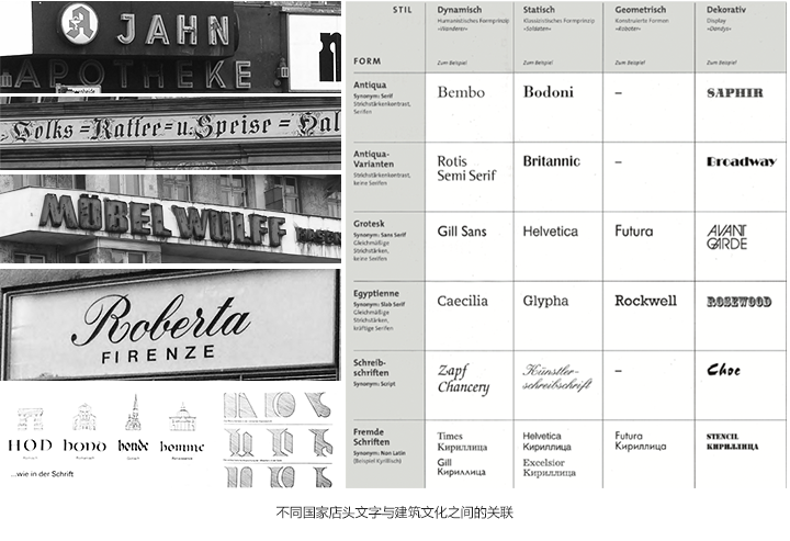 如在不同文化背景的國家,店面門口招牌字設計的不同,以及它與建筑文化之間的關聯;