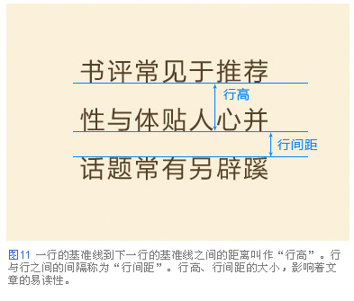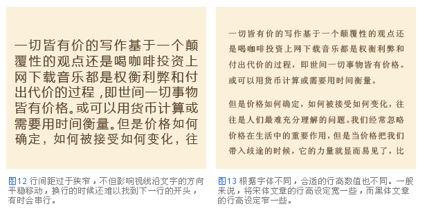 行高,行間距的大小對文章的易讀性有很大的影響。行與行之間拉得過開,從一行末尾移動到下一行開頭,視線的移動距離過長增加了閱讀難度。相反,行與行之間貼得過緊,上下挨得過緊影響了視線的移動,讓人不知道正在閱讀哪一行(圖12)。正文最恰當的行高,基本應該設定為其文章中文字大小的兩倍。例如文字大小為8px的文章,就應該把行高設定為16px(圖13)