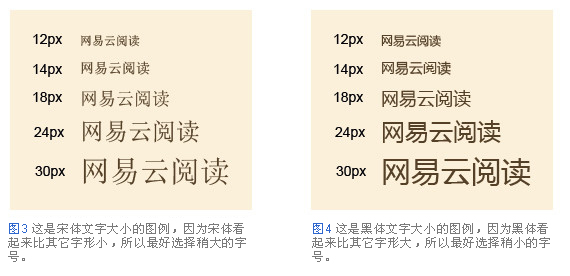 下圖是適用于一般文章正文文字大小的圖例。即便是相同大小的文字,字體不同看起來大小也不一樣。而且選擇文字大小時,需要考慮文章的閱讀方式,比如,是在大屏幕機器還是小屏幕。(圖3-4)