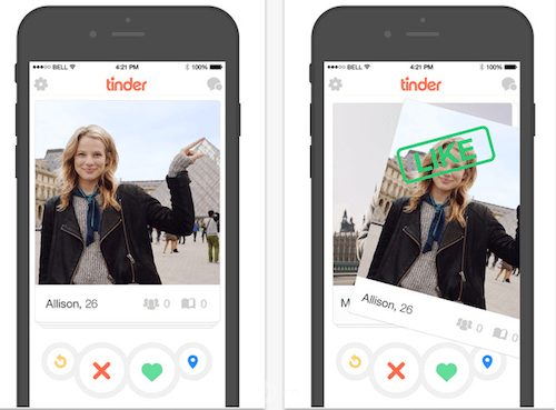 Tinder是一款交友軟件,其頁面設計的很簡單但是很精致。主體就是一張附近用戶的照片,你如果喜歡可以就向右滑動卡片,不喜歡就想左劃,就是這么簡單。很適合拇指操作。