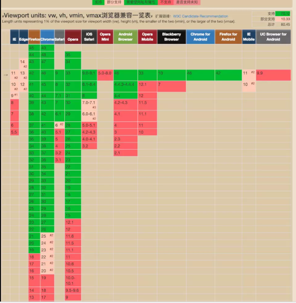 vw這個vw的方案,相當而言還比較新。vw 即(viewport width)可視窗口的寬度。之所以把這個方案放在后面來說,是因為viewport在去年(2017年)的時候存在不少的兼容性問題,各個瀏覽器的支持并不是很好。但是來到了2018年這個時間點,viewport單位意見得到了眾多瀏覽器的支持(80.45%)。