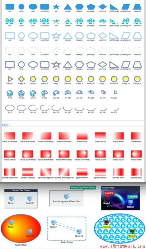剛才的例子我們提到了一個(gè) Group 類型,這個(gè)類型圖元節(jié)點(diǎn)在 GraphView 上顯示成了組合效果,可雙擊展開(kāi)合并,可跟隨著孩子節(jié)點(diǎn)的位置大小變化和自適應(yīng)變動(dòng),除了 Node、Edge、Group 外,HT 還提供了 Shape、Polyline、Grid、SubGraph 等多種圖元類型,這些圖元類型都具是有針對(duì)性的展示效果,以滿足各種行業(yè)的基本圖元需求:http://www.hightopo.com/guide...