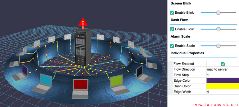 構(gòu)建出拓?fù)鋱D后很多人關(guān)系的是如何實(shí)現(xiàn)動(dòng)畫,動(dòng)畫從本質(zhì)上來(lái)說(shuō)就是在一定的時(shí)間點(diǎn)上驅(qū)動(dòng)圖元的參數(shù)變化,例如大小、顏色、粗細(xì)包括可見(jiàn)不可見(jiàn)等來(lái)實(shí)現(xiàn)各種動(dòng)畫效果,而 HT 本來(lái)所有圖元都是數(shù)據(jù)驅(qū)動(dòng),用戶隨時(shí)可以修改 Data 上的任何屬性,因此隨便起個(gè)定時(shí)器 windwo.setInterval 不斷改變圖元屬性值即可實(shí)現(xiàn)動(dòng)畫效果,但為了方便客戶 HT 還提供了諸多方便函數(shù)和插件。