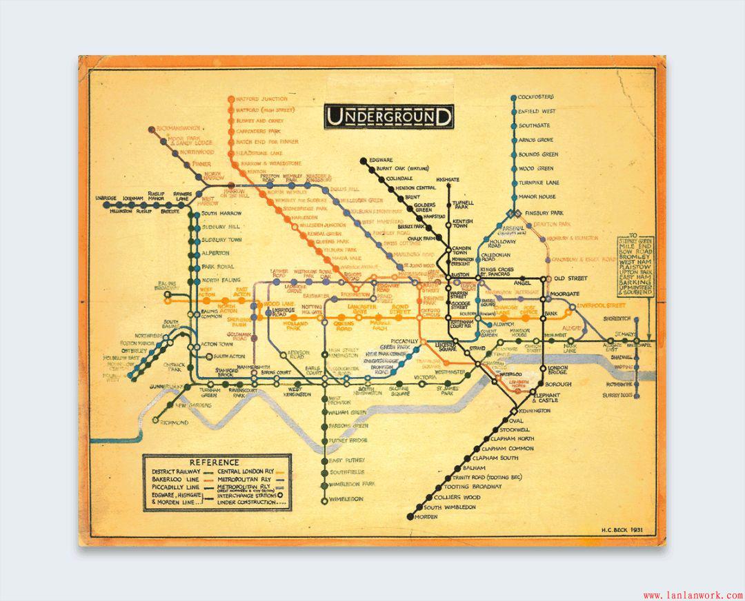 說到英格蘭,信息圖表歷史上的一大步是在1933年,當時哈里貝克創建了倫敦地鐵的第一張地圖,只顯示了描繪公共交通路線和車站的線路。這是一個重要的發展,因為它將視覺圖表移動到日常生活中。