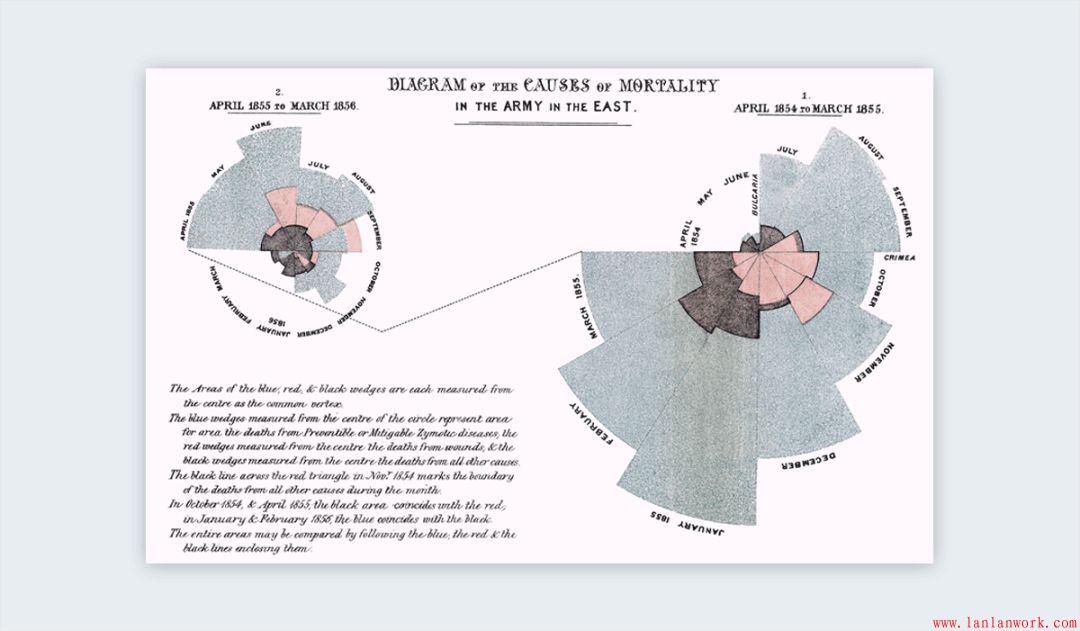 1857年,英國護士佛羅倫斯·南丁格爾使用信息圖形,說服維多利亞女王改善軍隊醫院的條件。她的圖表顯示了克里米亞戰爭每個月的死亡人數和原因:可預防的藍色疾病,紅色傷口和其他黑色病因。