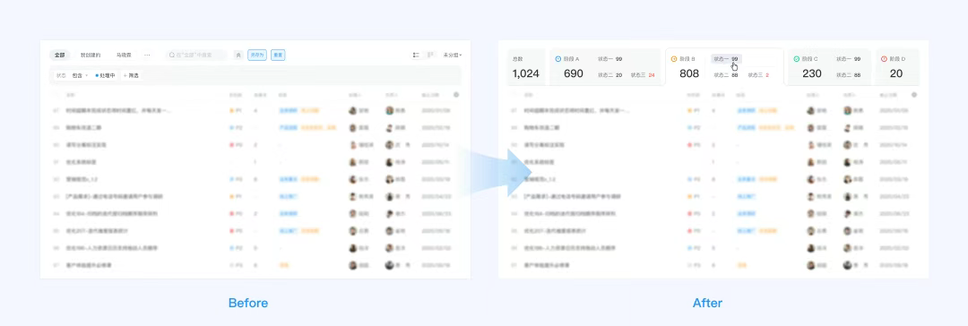 我們最初使用了數(shù)據(jù)可視化的看板來呈現(xiàn)各階段下不同狀態(tài)的概覽信息,但這只解決了數(shù)據(jù)概覽的問題,用戶還是需要點擊“詳情”才能跳轉(zhuǎn)至相應(yīng)的頁面。