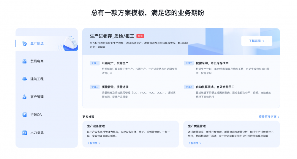 • 問題 - 方案” 式引導:在產品介紹頁加入 “你是否遇到 XX 痛點?我們的方案是 XX” 的邏輯,比如案例中 “生產設備管理” 板塊對應 “設備維護難、效率低” 的痛點。