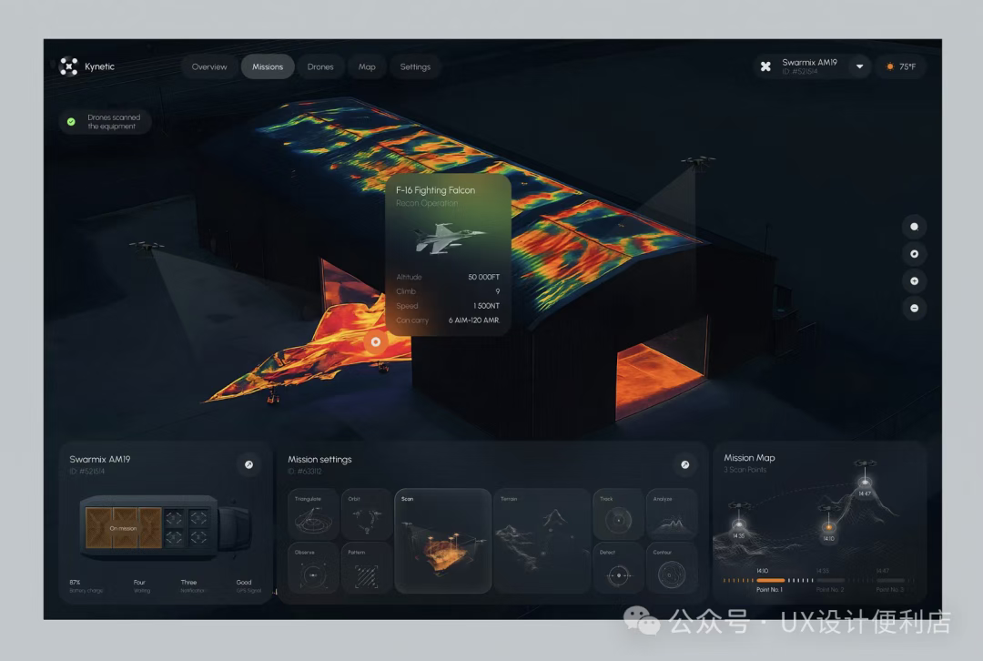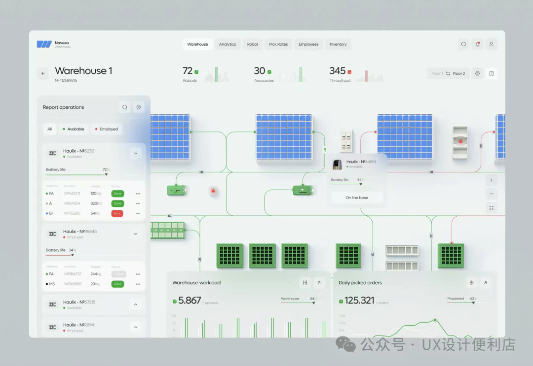 一直以來復雜的工業頁面或者dashboard,都會采用比較簡潔的UI效果,很少會增加一些質感。畢竟這類頁面的設計重點是突出信息。但是來自RonDesignLab 的設計,給我們打開了新的思路。