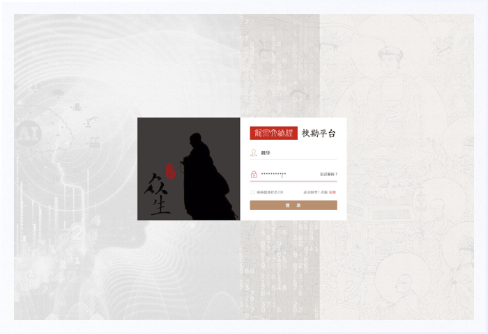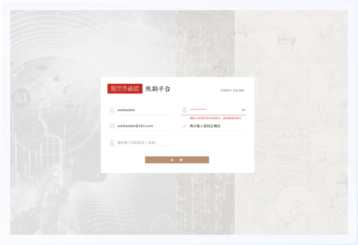 注冊頁是登錄頁的延伸頁面,可以與登錄頁互相切換。使用古典藏經圖案作為背景,上面疊加內容卡片且居中分布,在整體視覺上符合產品調性,在操作上完善各種輸入狀態的反饋。