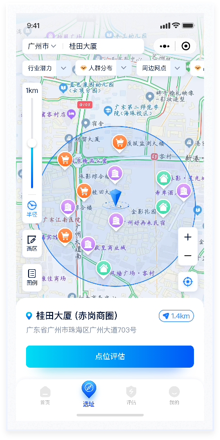 按鈕換膚在地圖上,“半徑”“選區”便于用戶對開店范圍的選擇,“圖例”則更側重圖標說明性。“放大”“縮小”“定位”則是對顯示內容的操作。