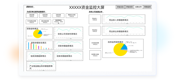 PC端駕駛艙頁面雖然和大屏的內容大部分相似,但使用的場景是財務公司各業務部門領導、數據分析人員使用,也包括各級領導日常運營決策查詢,公司會議。重點展示領導關注內容,定制化程度高,所以重點在于母版布局的擴展性和組件的通用性。